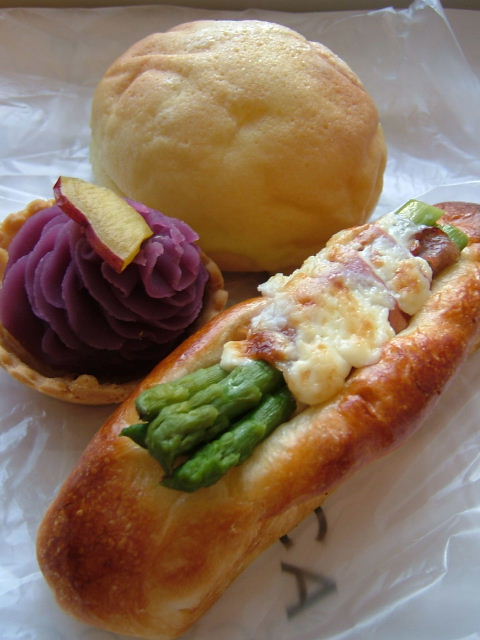 紫いものタルト、クイーンズメロンパン、バルケット(アスパラとベーコン)
