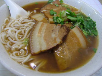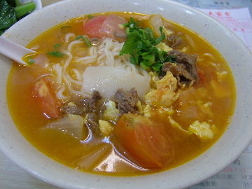 トマトと卵と牛肉麺。東坂肉麺。野菜もつけて、全部で300円。庶民的な味だけど、それでうまいよ。