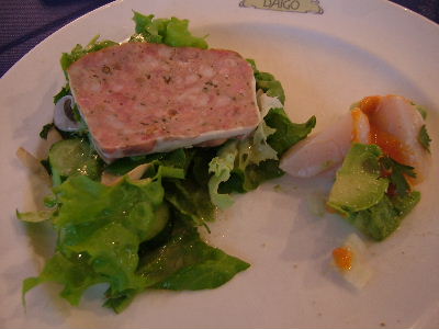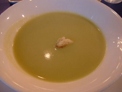 オードブルはパテ、ゆでホタテとアボカド。美味しい~。グリーンピーススープ。 Pate, scallop with avocado. Green pea soup.