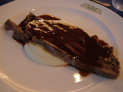 Roasted beef in red wine sauce. It is good but wish there was pork or lamb - not a big fan of beef steak.