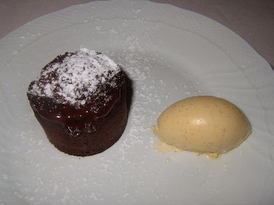 とろ~りとろけるチョコレートケーキ、バニラアイス添え。ベリーグッド~!ピスタチオのブランマンジェー、カプチーノ仕立て。Chocolate cake. Pistachio blanc manger.