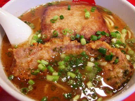 辛巻らーめん+豚天、980円。A big fried spring roll with meat and spicy miso paste inside, and I ordered an extra fried pork...^^;; The spring roll was very nice but somehow the paste was all squeezed into one corner, so you would be eating non-spicy meat most of the time and then in the last bite your mouth was full of spicy paste....I wonder if it was deliberate.