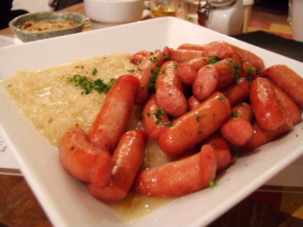 Sausages and pickled cabbage. Czech risotto...just tomato-sauce chicken rice with paprika.