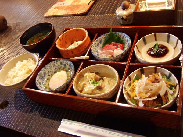 An amazing bento, from left to right, top to bottom: tofu, sashimi, raddish with miso, hotspring egg, grilled chicken in mushroom curry cream sauce, fried tuna with vinegar and spring onion, comes with bamboo shoot rice and miso soup on the side. I saw other people ordering the cheaper lunch set with either fish or meat, and they are the same stuff as the fried fish and grilled chicken included in the bento but of course in bigger portion. Everything tasted great. Even the dessert, bavarois that tasted of toffee, was very very good!