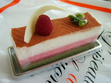 ピスタチオ、フランボワーズと生クリームのムース、470円。
