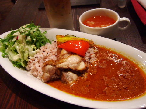 Genovese(basil paste) mixed with green soybean, green shiso and sour plum. The paste is underneath the salad. It is a bit too oily. The sample plate of spicy chicken and vegetable curry rice looked good so I went back for it...hmm, just normal. The food came really quickly both times and were not very hot.