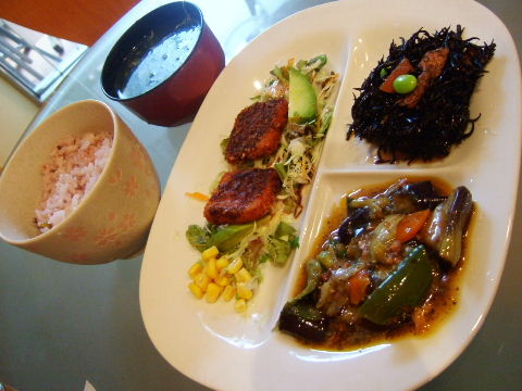 彩食から揚げ、マーネ ナス、生ひじきの煮物、玄米ご飯と岩のりスープ、850円。