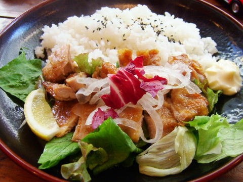 A piece of tasteless chicken(despite the fancy name) on top of plain rice and a few slices of lettuce without any sauce...frankly quite terrible. ^^;; The chai pudding is better, but if you don't order lunch, the cake is 450yen...not quite worth it.