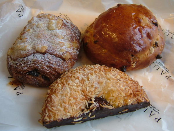 左から右:プーレロティ(ローストチキン、ディジョンマヨネーズあえ)、プラリネ(アーモンドクリームのプラリネ風味)、カヴァット(プリオッシュ生地にカスタードとチョコチップ)。