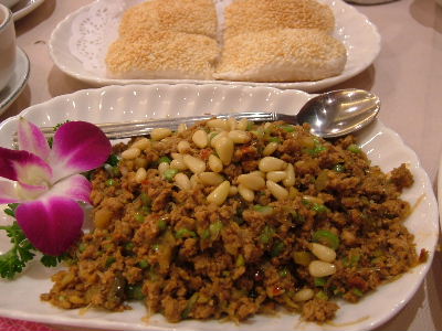 春雨、豚肉、野菜の小切りの炒め(中国風揚げパン二枚付き)、$48。ややしょっぱい。Stir-fried minced pork and vegetable. A bit salty.