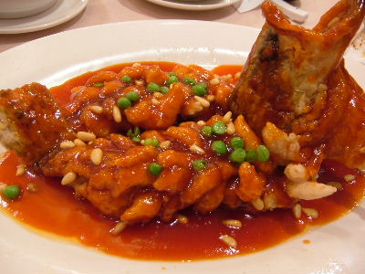 松鼠桂魚(甘酸っぱいソースかけ、松の実入り桂花魚揚げ、$88(特別価格)。なかなか美味しい。Deep fried mandarin fish and pine nut with sweet and sour sauce, quite nice.