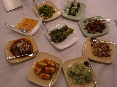 前菜いろいろ。すごく美味しい、ちょっと辛いけど。Brilliant appetizers, Sze-chuan style, i.e. spicy.