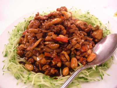 宮保鶏丁(鶏と野菜とピーナッツの炒め、スパイシーソース)。Fried chicken and peanuts in spicy sauce.