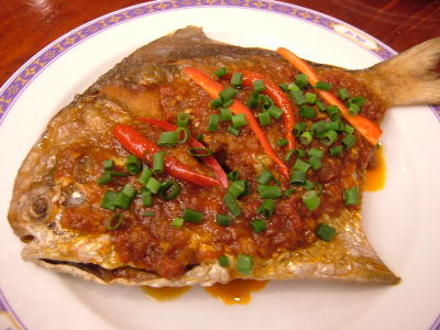 プラーラッ プリック(マナガツオの唐揚げ・辛口ソースかけ)。なかなか美味しい。Fried white pomfret with chillies sauce.