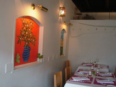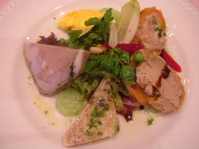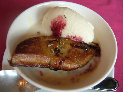 オードブルの盛り合わせ。鴨のロースト、カシス添え。ココナッツのブラマンジェ。前菜は前回と同じものを注文しちゃって、失敗。鴨は前回の羊より好み。美味しい美味しい。隣のテーブル見ると、パルサミコにオリーブオイル、みたいなソースが多い気がする。ランチコースは1680円。Roasted duck in cassis sauce, v. good! Coconut blanc manger, a bit too sweet but good too.