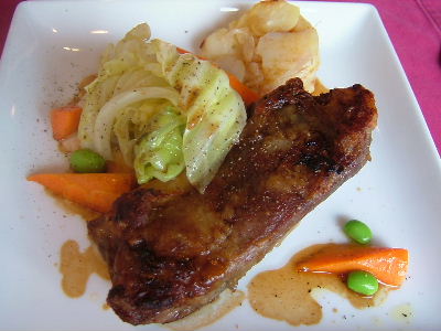 フォアグラのポワレ、玉葱のアイス、スープとフランとともに。これは、ちょっと驚き。初めての味。美味しい~。豚のスペアリブのコンフィ。Pan-fried foie gras, with ice, soup and fran made from onion. Really really good! Pork spare-rib. The potato is layered with a thin slice of ham.