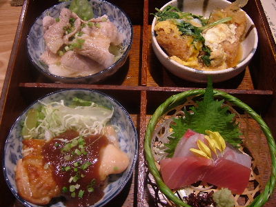 信州富倉そばとサラダかつお丼、890円。The soba is very good but the salad katsuo rice bowl is bad - can't quite handle the idea of thousand island salad dressing on rice!!