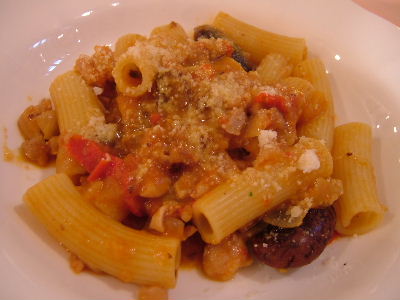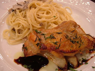 鶏肉と花豆の煮込みソースのリガトーニ。ロイヤルポークのソテーキノコのマルサラソース。ランチは2100円。