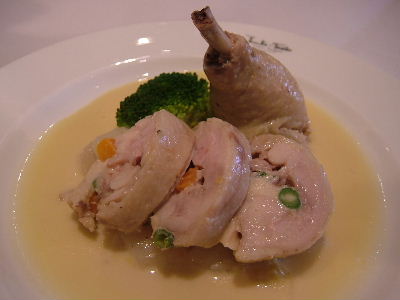 Dinner course. Chicken liver mousse and Platinum pork rillettes. First appetizer: Lobster consomme gelee, hair crab and cauliflower bavarois, organic spinach sauce. Second appetizer: Iberico pork ravioli, red wine sauce. Main: Roasted Col-vert duck, mushroom and potato on the side. Dessert: Marron souffle. I chose gibier(wildlife animal) for my main dish and ordered wine so it came up to over 11000yen...^^;;; Very nice though! The pork dumplings were wonderful too. And gosh, I had two souffles in a day....but this one is chestnut flavour with chestnut ice-cream....I can never resist chestnut!
