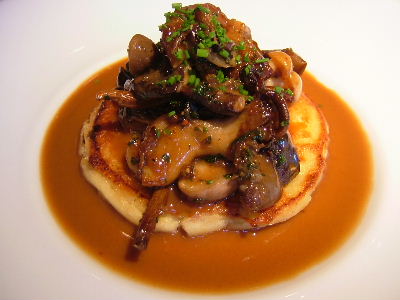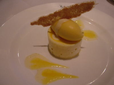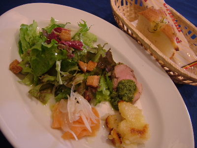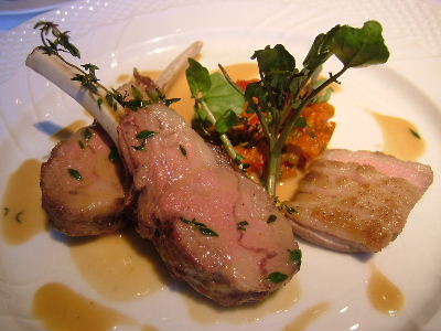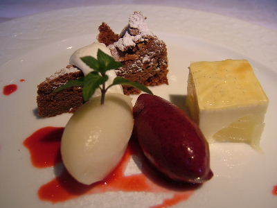 前菜: キノコのガレット仕立て、ポルチーニ茸のクリームソース。ソースはかなりしょっぱい。ワインを飲んでなかったせいかもしれないけど。主菜: 骨付き仔羊のロースト、タイム風味。柔らかくて美味しい。やっぱり味濃い。デザートの盛り合わせ: アイスは洋梨とカシス味。