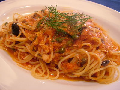 イワシ、ケッパー、オリーブのトマトソーススパゲッティ、1050円。具もスパゲッティもすごいボリュームだね。