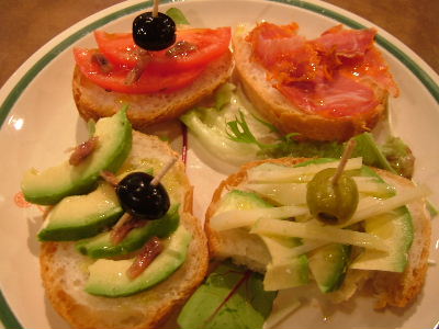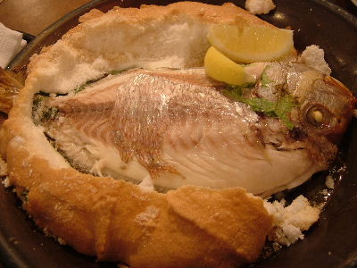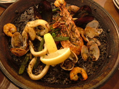 ピンチョス4種盛り合わせ。本日の魚(鯛)丸ごと塩釜焼き(2人前)。イカ墨のパエジャ(2人前)。ドリンクサービス券持参で、合計6000円ぐらい。