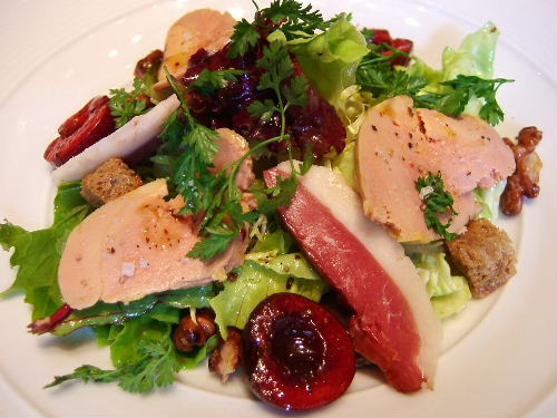 Mesclun leaves, shaved duck foie gras, gizzard confit, shaved smoked duck breast & sugared walnuts, bing cherries, merlot dressing.
