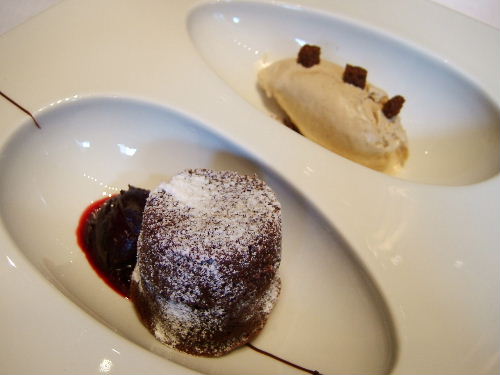 Flourless "grand cru" manjari chocolate cake, cabernet sauvignon stewed bing cherries, festive christmas tea ice-cream, crispy gingerbread croutons.