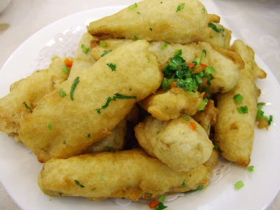 Fried aubergine with pepper salt. Beancurd dumplings. Fried veggy dumplings.
