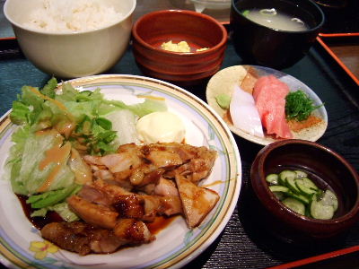 地鶏照焼き定食。Chicken teriyaki lunch, 880. My god it is absolutely horrible, couldn't finish even half of it.