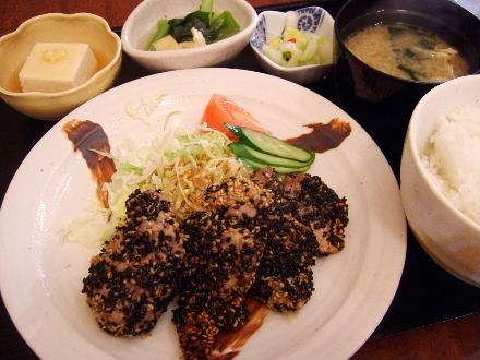 豚ヒレごま焼き。Grilled pork with sesame seed, 800yen. A cute little shop with the madam cooking everything and a girl serving. Food is home-made style and very healthy-tasting.