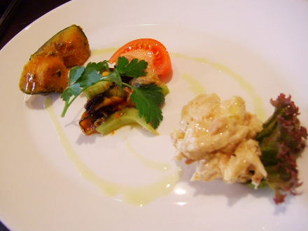 真鯛トマトのスパゲッティ、鱈のサフランソース。Lunch set includes tofu salad, bream and tomato spaghetti, pan-fried cod in Saffron sauce, dessert and coffee, 1470yen. Taste-wise it is actually quite good, but the service is kinda shockingly bad. The salad didn't come first while I waited with no food, and then the salad, the spaghetti and the fish all came at the same time....a bit of a rush to eat everything before they get cold. The waitor especially asked if I would like rice or bread when I ordered, but it never came....The dessert came after I already finished the coffee....and the poor couple next to me had no forks to eat with and had to beg the waitor for them....err....^^;;