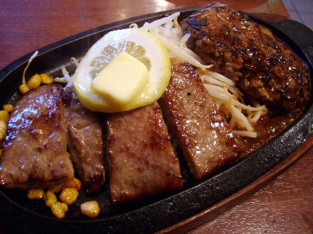 霜降りスライスステーキ&ハンバーグ、セットで1050円。Steak and hamburger set. The steak is quite good but the hamburger is so-so. The cook and the waitress were both chatting in Thai...this is a steak house though. ^^;;