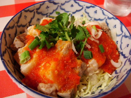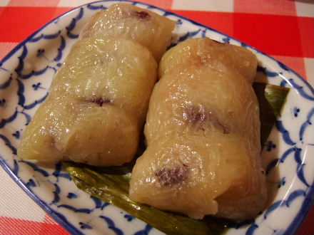 豚の角煮、500円。カオ・ドム・マッ(ココナッツ風味のもち米と小豆をバナナの葉っぱで包んで蒸しあげた。中にはバナナが入ってる)、530円。The name of the pork appetizer is misleading cos it is just plain boiled pork with some chilli sauce on top and salad at the bottom, no good. But the dessert is so nice!!!!! It is coconut sticky rice with red bean, banana stuffing. For some reason one has stronger coconut taste, while the other has stronger banana taste...wonder if it is deliberate but both taste very good.