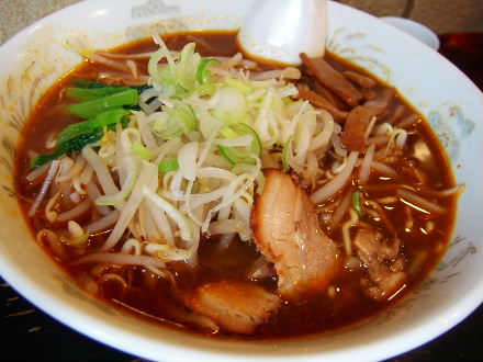 もやしそば(辛)、700円。It is very good!! I like the soup very much. I went when it was not so busy as usual, and four separate customers came and they were all talking to the master and the madam like they were good old friends. One guy was tallking about manga...(^^;;) Also two guys wearing chef clothes came in, chatted a bit, and took two bowls of ramen to go...wow.