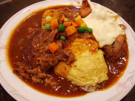 オムライス ビーフキノコソース、800円。Omelette rice with beef and mushroom sauce. The name doesn't say anything about the hamburger, the croquette and the fried chicken with the pile of mayonnaise....^^;; Maybe because all the side things were already cold and not freshly made, and because of the overall saltiness, I felt like I was eating a super huge convenience store lunch box. ^^;; The omelette rice and the sauce were hot though, and it IS very good value.