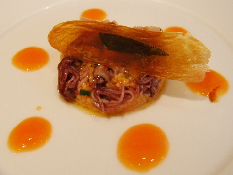 Octopus and couscous, a thin slice of fried potato on top(had the potato slice last time too!).